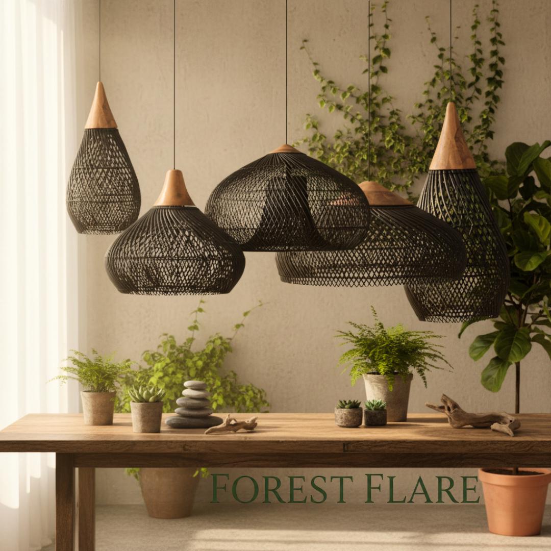 The Forest Flare presents Rattan Lamp shows a natural take on classic pendant lighting. It has a teak top and organically shaped handwoven rattan details all down the side, crafted according to ancient Javanese technique. Available in various sizes and in natural or charcoal finish. Hang alone, or create a cluster of pendants, mixing various sizes and shapes.