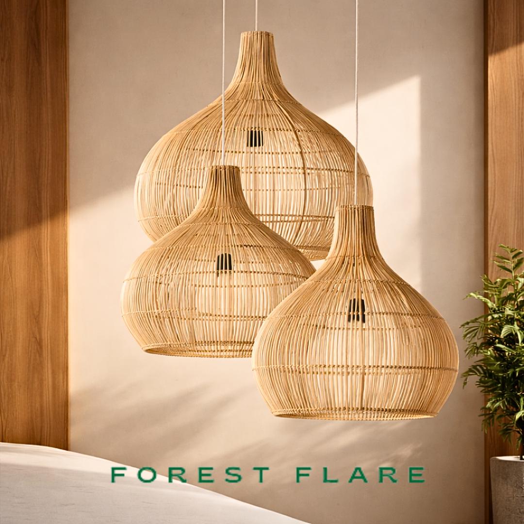 The Forest Flare presents Rattan Lamp shows a natural take on classic pendant lighting. It has a teak top and organically shaped handwoven rattan details all down the side, crafted according to ancient Javanese technique. Available in various sizes and in natural or charcoal finish. Hang alone, or create a cluster of pendants, mixing various sizes and shapes.